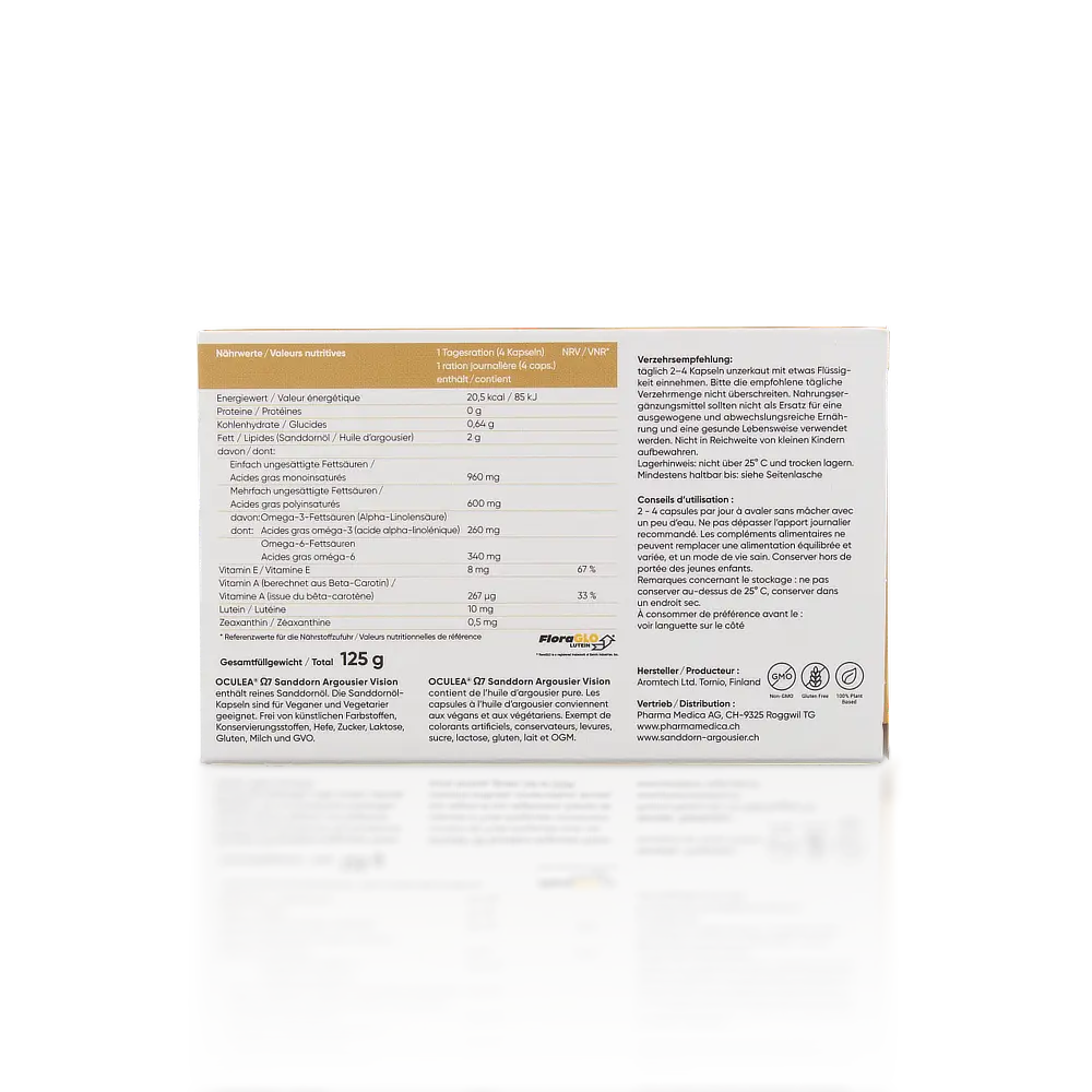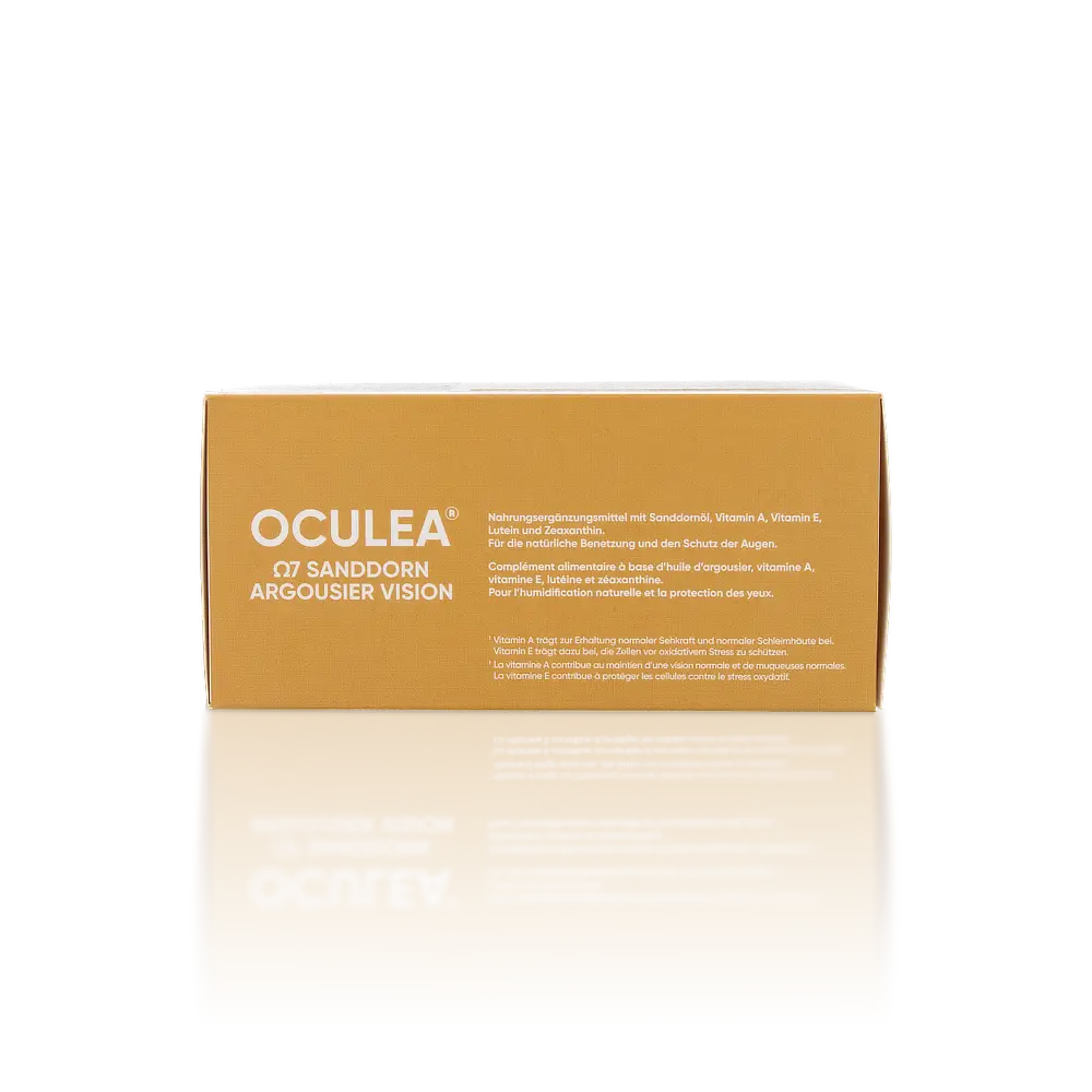 In den OCULEA® SANDDORN Kapseln steckt die ganze Kraft der Natur. Das Nahrungsergänzungsmittel beinhaltet reines Sanddornöl und Beta-Carotin, eine Quelle für Vitamin A, das zur Erhaltung normaler Sehkraft und normaler Schleimhäute beiträgt. Das enthaltene Vitamin E trägt dazu bei, die Zellen vor oxidativem Stress zu schützen.